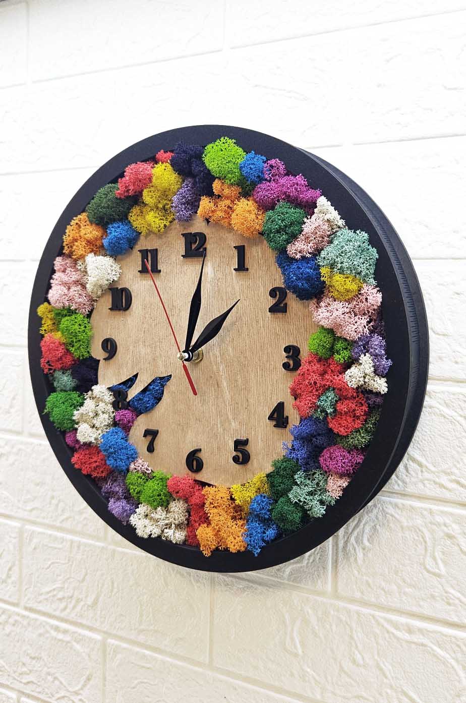 Ceas de perete decorat cu licheni stabilizati colorati si decor din lemn. Ceasul este realizat din MDF de 2,5mm si are agatatoare la spate. Poate fi un cadou deosebit pentru cei dragi.