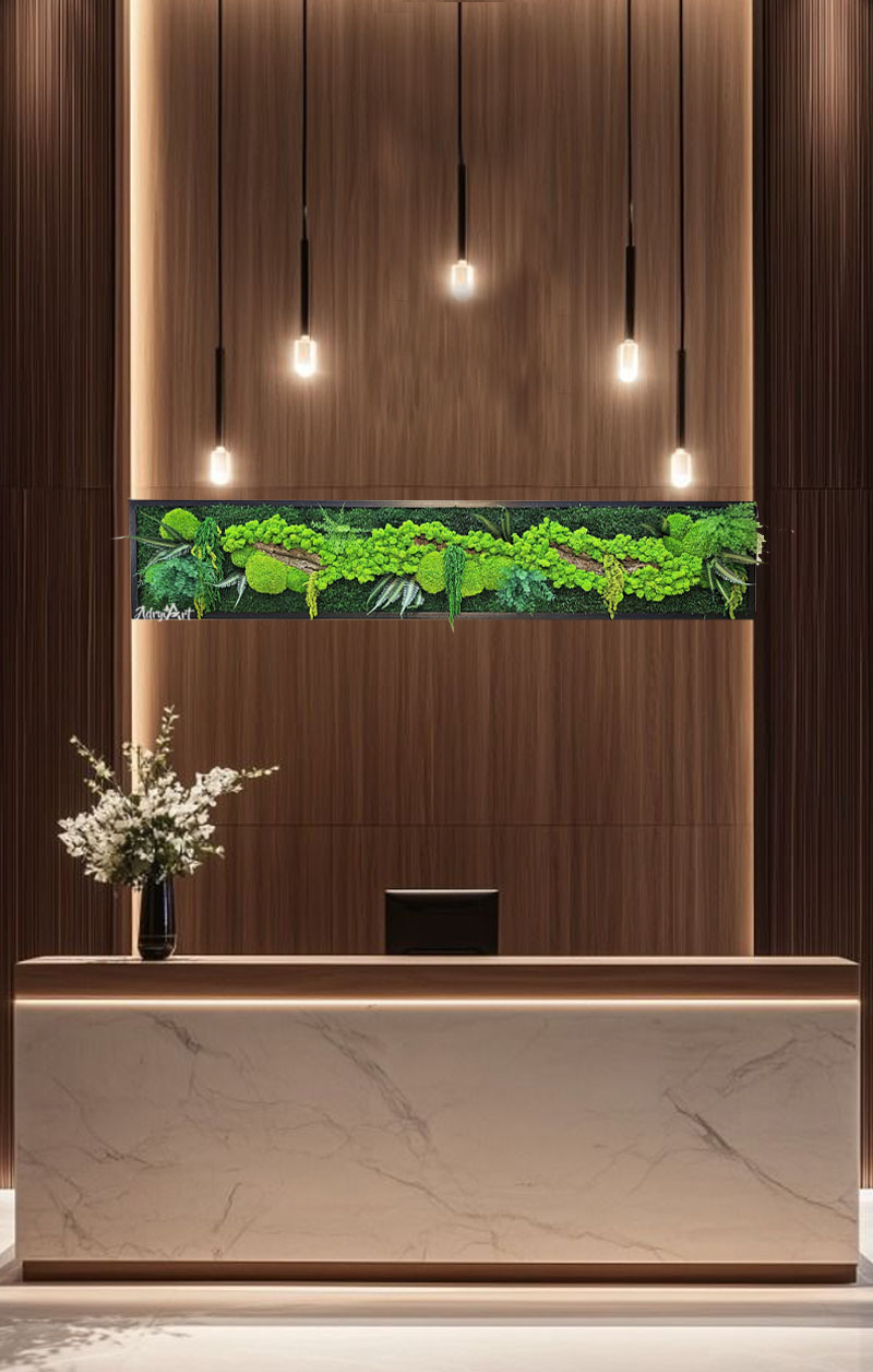 Acest tablou panoramic, realizat manual din licheni, muschi bombati, muschi de padure, feriga si amaranthus stabilizat, este alegerea ideala pentru clinici, hoteluri, receptii, birouri si sali de conferinta. Designul natural, in nuante vibrante de verde, creeaza o atmosfera relaxanta si profesionala, impresionand vizitatorii inca de la intrare.