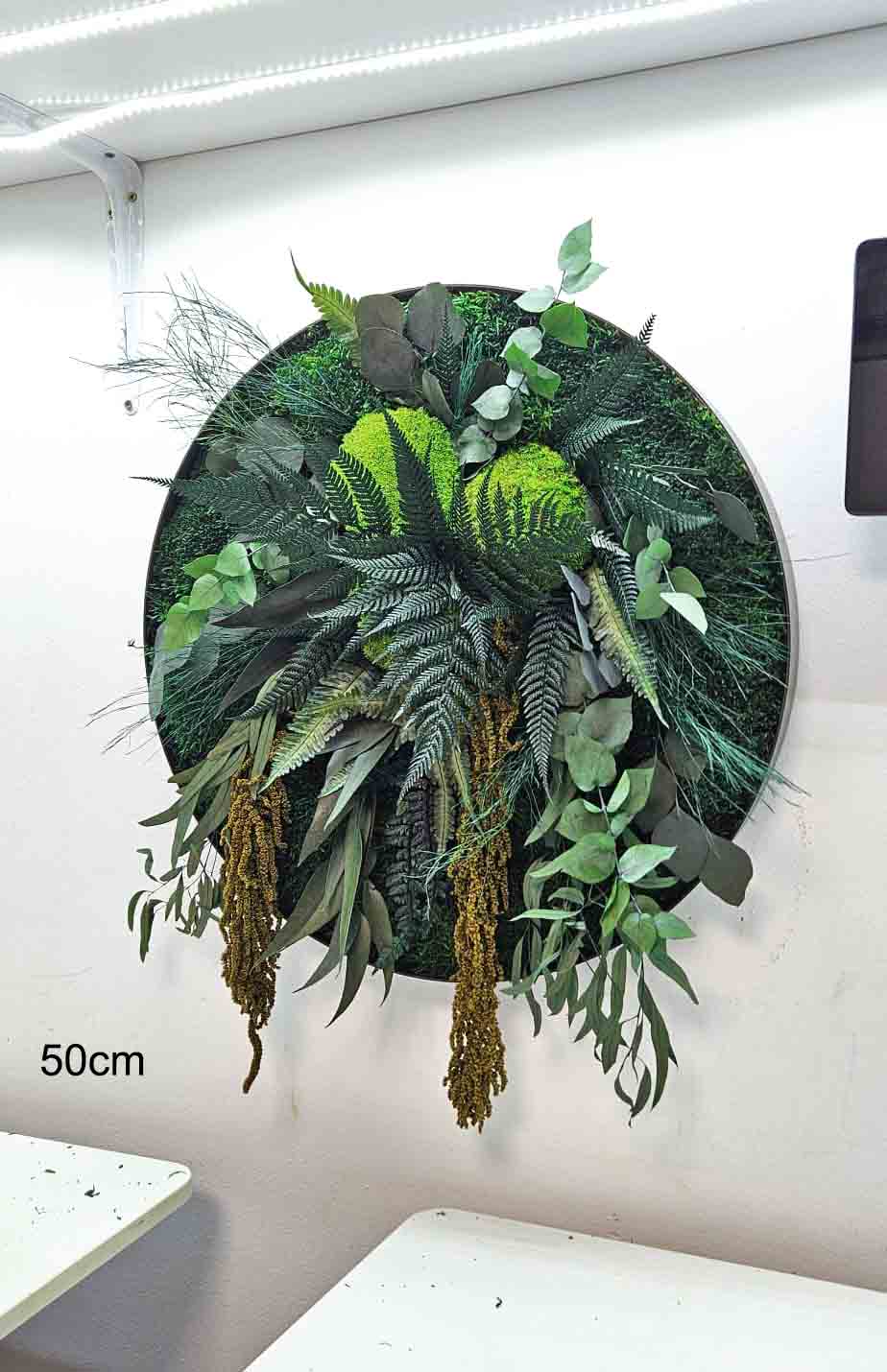 Acest tablou spectaculos este realizat manual dintr-o combinație bogată de mușchi și plante stabilizate, atent selectate pentru a reda un decor luxuriant, cu un impact vizual puternic. Cu o compoziție echilibrată între texturi și nuanțe de verde, lucrarea aduce natura mai aproape, fără a necesita întreținere.